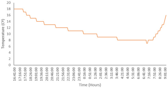 The temperature values are presented in Figure 24. The temperature decreased throughout the night and increased rapidly in the morning. The changes in temperature were more spaced between 00:00 and 7:00.
