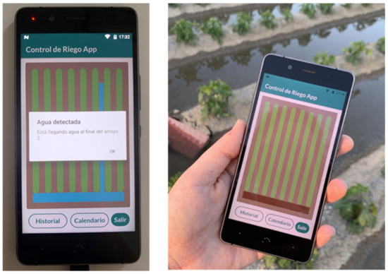The user application was tested in real time on a field of vegetables. The execution of the application on the mobile phone is presented in Figure 26. As can be seen, the system detects and displays the ditches where there is water. Furthermore, a text box indicates the area of the ditch the water has reached.