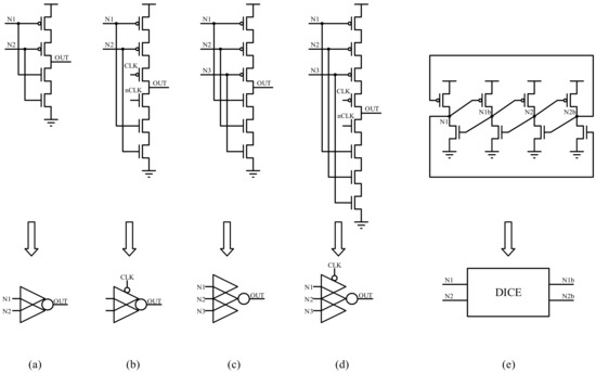The C-element and the dual interlocked storage cell (DICE) are the most extensively used in the design of radiation-hardened latches. The 2-input and 3-input C-elements are shown in Figure 1a,c.