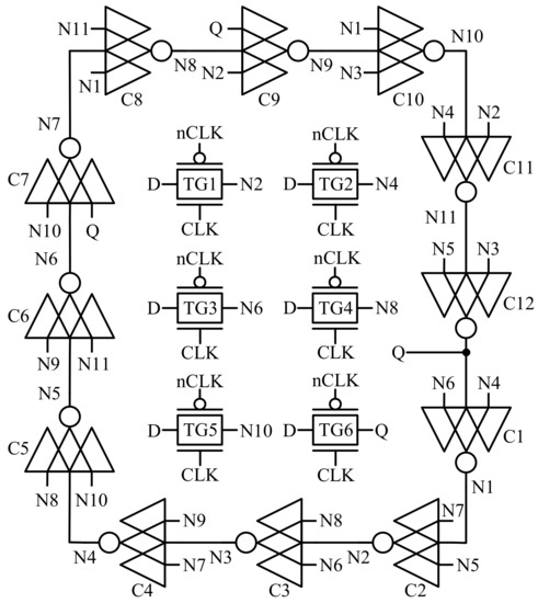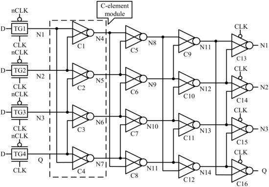 The HTNURL latch is proposed and demonstrated in Figure 9. CLK and nCLK represent the system clock and negative system clock, respectively; TG1–TG4 represent four transmission gates (TGs); N1–N15 represent the data nodes inside the latch; C1–C16 represent 2-input C-elements. It should be noted that C13, C14, C15, and C16 represent CG-based 2-input C-elements. The sensitive nodes in this latch are N1-N14 and Q. The latch is mainly composed of 4 stage C-element modules, and each module is composed of four 2-input C-elements. Each 2-input C-element flows to the input of the two C-elements in the next stage, and each input of the 2-input C-element comes from the 2-input C-element in the previous stage, thus forming a feedback loop.