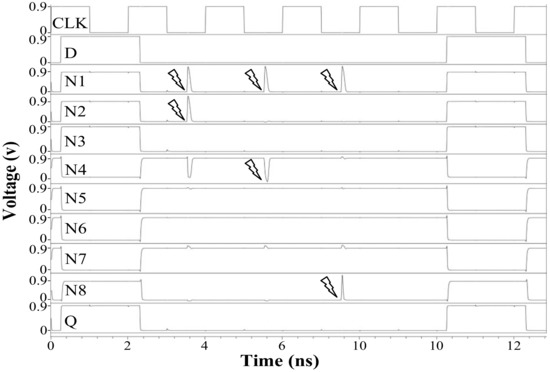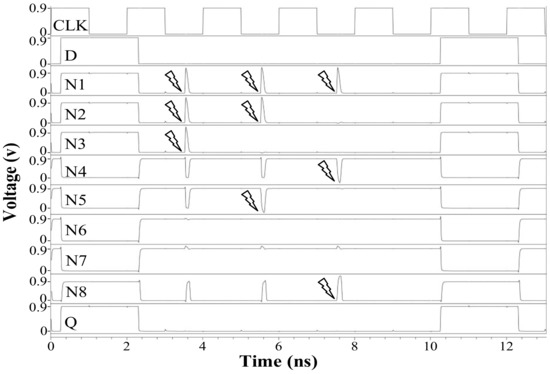 Figure 13 demonstrates the simulation for TNU injections of the proposed HTNURL latch. Current was injected into (N1, N2, N3), (N1, N2, N2), and (N1, N4, N8) in turn. After current injection into the node set (N1, N2, N3), it can be found that N4, N5, and N8 are flipped instantly, and then all the affected nodes are recovered to their correct values.