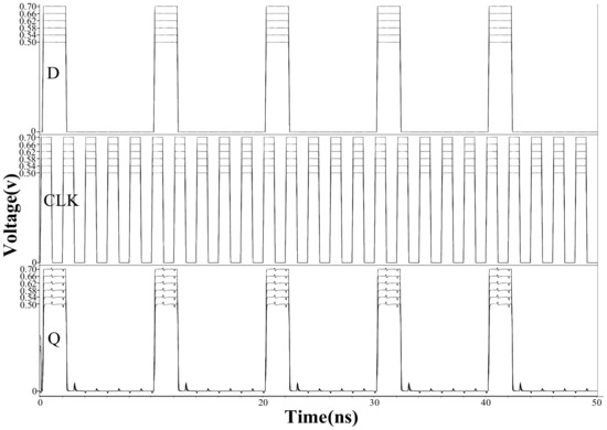 Scaling down the voltage to the sub-threshold/near-threshold regime increases the energy efficiency of the circuits. This technique is widely used in electronics circuits. As shown in Figure 14, the proposed latch works well with the supply voltage ranging from 0.5 V through 0.7 V with a step of 0.04 V. It means if we scale down the supply voltage into the sub-threshold/near-threshold regime, the latch can provide not only good robustness but also a lower power consumption.