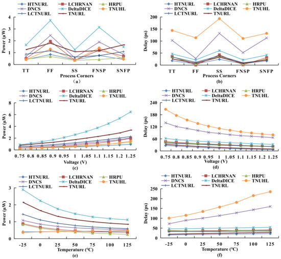As shown in Figure 15a,b, the power consumption and delay of the latch vary with the change of process corner. The power consumption of the HTNURL latch is minimal at the SS process corner, the delay of the HTNURL latch is minimal at the process corner of the FF, while it is maximal at the process corner of the SS. The power consumption and delay variations of our latch under different process corners are smaller than those of typical TNU-tolerant/recoverable latches.