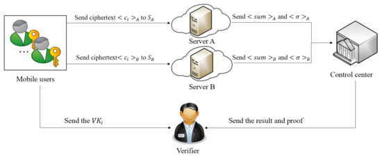 Cloud servers: This system consists of two non-colluding servers, and , mainly to realize non-interactivity between users and keep the aggregation results confidential to the cloud server. They will aggregate these vectors and also generate the corresponding proofs when they receive masking vectors from n mobile users. Then, the aggregation results and proofs are sent to the control center.