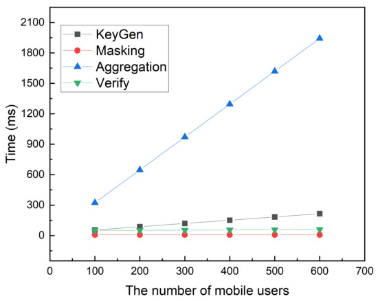 Then, we change the data dimension when the number of mobile users is fixed , and it can be seen that the overhead of each phase increases with the dimensions. It can be seen from Figure 3 that the computational overhead of the key generation phase is independent of the data dimensions when the dimensions are set from 100 to 600. In the masking phase, the time cost of the user is between 16 and 96 ms. In the aggregation phase, the computational cost of the server is between 320.04 and 1920.24 ms, while the computational cost of the verification phase is between 62.02 and 142.02 ms.