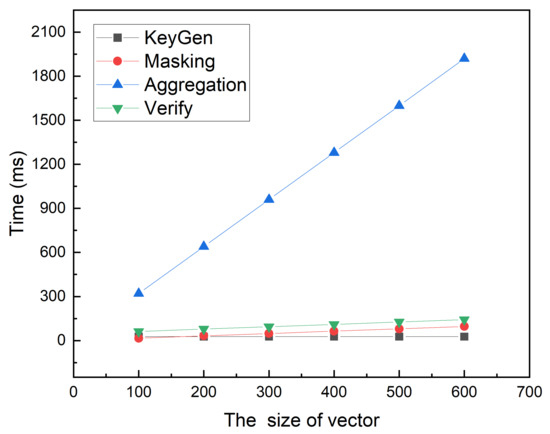 In the proposed aggregation scheme, the mobile users were set from 100 to 600, while the private data dimension is fixed at . As shown in Figure 2, we compared the relationship between the computational cost of each phase and the number of users n. In the keyGen phase, the main computation overhead is to compute the key of the public verifier, which requires . In the masking phase, the main computational cost is to calculate the verification key on the client side, which only requires and is independent of the number of users. In the verification phase, the verifier mainly verifies the Equation (5), which requires . As shown in this paper, n is set from 100 to 600, and m is only set to 10. Therefore the computational cost of key generation is the largest. We can see the computation overhead in the aggregation phase is between 324 and 1944 ms, while that in the verification phase is between 51.2 and 61.2 ms.