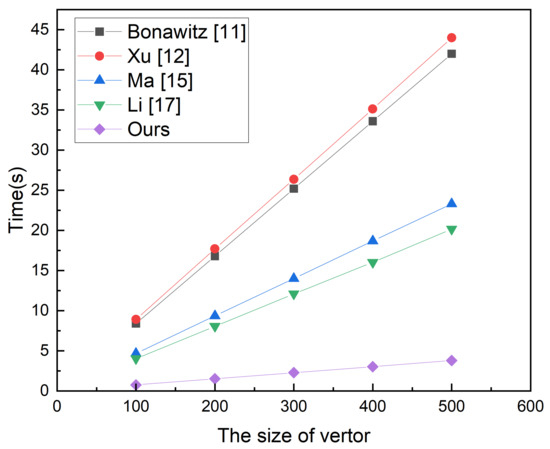 In the experiments, as shown in Figure 4, we compared the time cost of the user-side of different schemes, which varies with the dimension of the data. Specifically, the number of users is set at , and the data dimensions vary from 100 to 500. The experiments suppose an ideal situation where no mobile users drop out during the aggregation phase. Since the schemes in [12,13] use secret sharing and the Diffie-Hellman key agreement protocol, the time cost of their schemes is relatively high. However, Ma et al. [16] employ proxy re-encryption and aggregation signatures, which contain modular exponentiation operations, so the computation cost is not large. The scheme in [20] adopts key agreement and the aggregation coefficient to mask the private data, which only contains a small number of modular exponentiation and modular multiplication operations, so the time cost is not large. In the non-interactive and secure data aggregation scheme, the main overhead of mobile users is to calculate the verification key, which only contains a small number of modular exponentiation operations. Therefore, we can see that the computation cost of the other three schemes is much higher than ours.