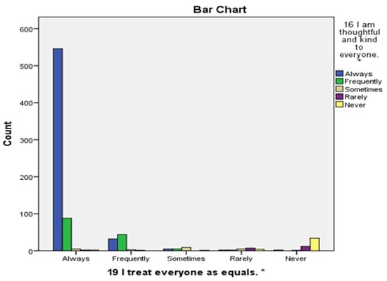 | 19 I treat everyone as equals. * | Always | 546 | 88 | 5 | 2 | 2 | 643 |