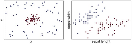 Iris data consist of three classes (Iris Setosa, Iris Versicolour, and Iris Virginica), each of which has four features, namely sepal length, sepal width, petal length, and petal width. We consider a two-class dataset {Iris Setosa, Iris Versicolour} with a size of 100 data points, and each class is characterized by two features (sepal length, sepal width) shown in Figure 1 (Right) and Table 1.