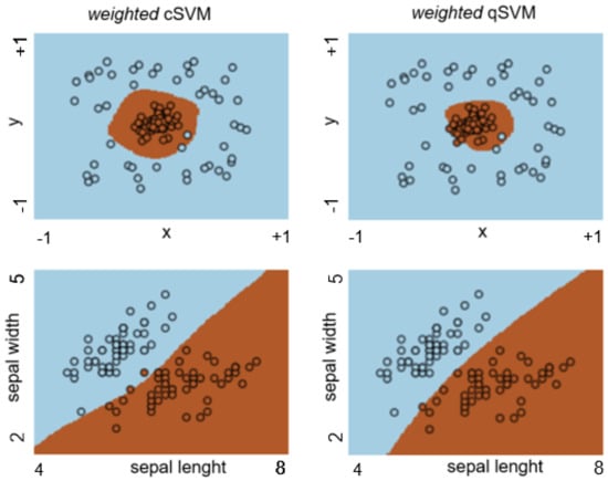Top: Synthetic two data; Bottom: Iris data. The visual results of our experiments generated by the weighted cSVM given in (16) and weighted qSVM expressed by (24). Our visual results demonstrate that our weighted qSVM generalizes the decision boundary of a given dataset better than its counterpart weighted cSVM.