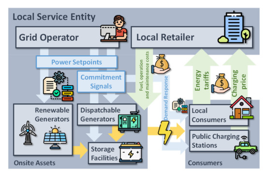 Because of the heterogeneity and conflicting interests of the different agents involved in the NG operation, their coordination is frequently addressed in a centralized fashion by the grid operator. This agent is usually integrated into the local service entity along with the local retailer [13]. In remote isolated areas, the local service entity usually owns the on-site generation and storage assets [14]. In such a case, the operator must ensure the supplying quality and reliability at minimum cost, in order to maximize the benefits obtained by the retailer. To this end, the operator can exploit public infrastructures such as charging stations [15,16], in order to complement the incomes obtained from energy supplying. Thereby, it is essential to operate the grid in an optimal way efficiently exploiting the different available resources and taking advantage of the flexibility provided by DR programs.