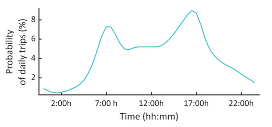 In this paper, a stochastic model for the considered public charging stations has been developed. The developed model is based on the vehicle trip distribution (), which is shown in Figure 5 for a typical weekday in US [16]. This distribution indicates the probability of an EV is driving on road at each hour of the day. It is realistic to assume that the probability of charging events will increase with the probability of a vehicle driving on the road [16]. Thus, the probability of charging events each hour of the day can be adjusted to the probability distribution shown in Figure 5.