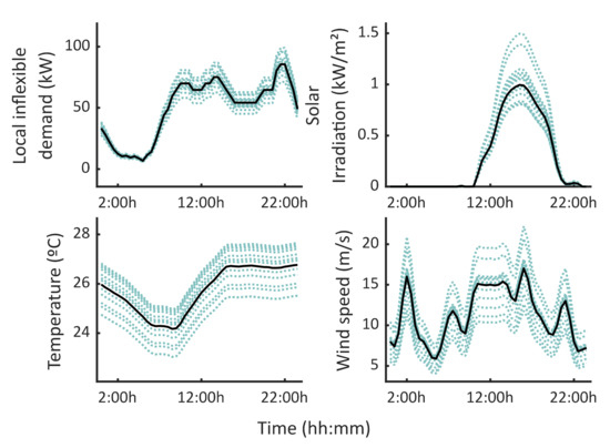 For creating the scenarios for uncertain parameters, several public databases were used. Figure 7 shows the forecasted profiles for the solar irradiance, temperature, local demand and wind speed along the scenarios generated using the methodology described in Section 4. The considered weather profiles were taken from Ref. [54] and correspond with real data observed at the Virgin Islands on 3 May 2016. The forecasted profile corresponding to local demand was adapted from real demand measurements at La Palma Island at the same date, which is available in [55].