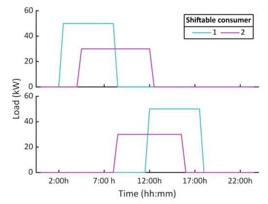 On the other hand, and with the aim of completing the analysis, it has been also considered the case in which the shiftable loads could not be operated in a flexible manner. In such a case, it is assumed that these consumers desire to start their operation at the first slot of the allowable time window, which is ensured by the model (18)–(20).