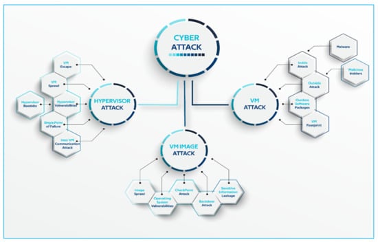 This section has identified and evaluated numerous virtualized cloud security issues and challenges revealed in recent years in diverse virtualization components, such as VMM, VMs, and guest operating systems, and disk storage images and devices [43]. Attackers use specific malicious and spiteful programs and tools in VMs to get illegal access permissions to record and log different screen updates and keystrokes across physical and virtual server machines (terminals) to gain sensitive and critical information required. Once a cloud network is compromised, it becomes relatively easy to duplicate and copy live VM images to create and configure new VM image files causing VM image sprawl. In this vulnerability, a colossal number of rogue VMs are created to generate DDoS and other types of network attacks. Similarly, attackers and intruders cause hypervisor-based attacks to exploit the vulnerabilities. The hypervisor controls multiple operating systems to operate concurrently on a single hardware platform, usually the physical server machine. A hacked and compromised hypervisor allows hackers to attack and control each VM installed and configured on a virtual host. Attackers use different APIs, software stacks, and coding bugs to control the degree of security assurance for the privacy and secrecy of cloud environments [44]. Figure 3 highlights various attack types in different virtualized environments.