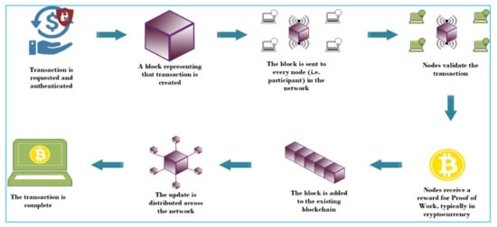It is one of the earliest and most popular digital currency-based blockchain platforms that runs on top of the blockchain infrastructure. It allows transactions between peers without a third-party, central authority, or server to issue and manage the currency transactions for many of today’s most popular cryptocurrencies. The bitcoin transaction information is always displayed on the ledger network so that all participating peers can validate and verify it to limit the currency issuance problem. The electronic currency supported by bitcoin is called a digital signature and is a chain of signatures in the blockchain network, as shown in Figure 4. When a peer performs a transaction in the network, the transaction owner’s coin is transferred to the next chain on the ledger with the hash value calculated from the previous transaction. The digital signature is transmitted to the public key of the next owner. The recipient peer of the signature can confirm and verify the ledger’s ownership to validate the blockchain network’s processed transaction [74]. In this way, all the participating peers on the network have the same blockchain and transaction records as stored by the peer nodes. Nevertheless, the invention of other blockchain platforms such as Ethereum and Hyperledger blockchains has wholly transformed this technology’s potential use in almost all industrial and technological domains. The potential use of space for blockchain has become interminable.