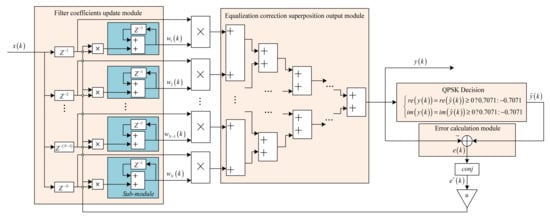 To optimize the structure of the VM-DDLMS algorithm, the VM-DDLMS algorithm is parallelized and divided into four parts: the filter coefficient update module, equalization correction superposition output module, QPSK adjudicator module, and error calculation module. When the signal is the frame header or the pilot, the filter coefficient update module updates the filter coefficients according to the input signal and the error signal , and the filter coefficient update sub-module is controlled by the signal. The equalization correction superposition module will obtain the equalization output by parallel accumulation . The QPSK adjudicator makes a symbol decision on the equalization output of the training sequence. The error calculation module calculates the error signal based on the equalization output and the QPSK decision output . To further improve the operating frequency of the VM-DDLMS algorithm, a pipeline design was carried out according to the structure of Figure 4, and registers were inserted between the combinational logic, which was divided into several small combinational logics to further refine the operation process and reduce the delay. As shown in Figure 4, the VM-DDLMS algorithm parallel structure inserting registers for the pipeline design is very clear and less complex.