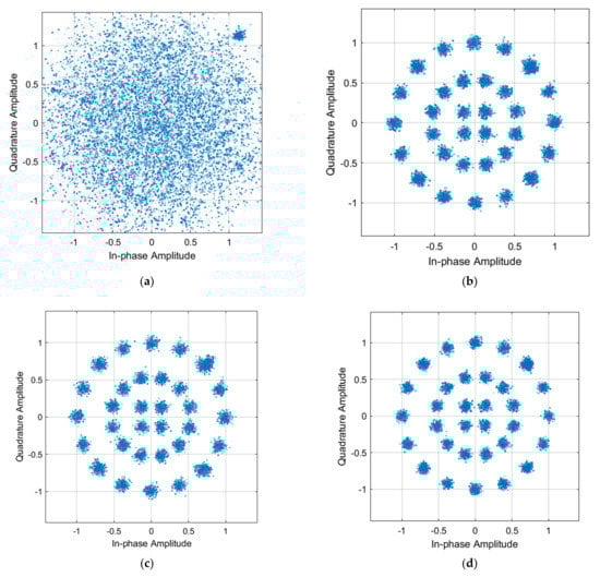 (a) Equalizer input signal constellation; (b) CMA equalizer output signal constellation; (c) MCMA equalizer output signal constellation; (d) VM-DDLMS equalizer output signal constellation.