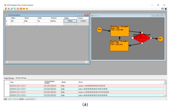 A GCS for automation equipment with communication integration was developed to address quick changes in the production-line processes. A graphical interface is needed to package the machine communication and commands into graphics to develop and quickly change the process needs. Then, we used a simple flowchart to build the relationships of the production-line control process, as shown in Figure 2. As shown in Figure 2b, there are three most commonly used functions, namely the circle responsible for the beginning and end, the rectangle responsible for the program steps, and the diamond responsible for decision-making. In the flowchart example, Rectangle-0 executes the action of writing Y0 as 0 after the program flow starts. In the next step, Diamond-0 determines whether M50 is 1—if it is, it ends the program; if not, it skips to Rectangle-1 to execute writing Y0 as 1, and jumps to the rectangle to continue execution. When the process needs to be changed, a block can be dragged to the appropriate position, and a relationship can be developed to complete the modification. In the present study, an object-oriented programming method is adopted to subdivide the system into many classes to develop suitable system architecture. Therefore, this system is more convenient for maintaining or updating the system in the future. The class hierarchy proposed in this research is shown in Figure 3. It is divided into the GCS main interface, communication area, login area, and graphical area. The composition, structure, and functions of each area are described in the next sections.