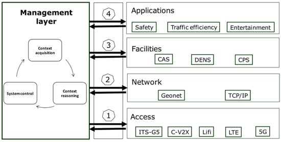 Because applications of C-ITS have to operate in heterogeneous conditions, in terms of environmental situations (e.g., road types, weather conditions) and technologies (e.g., communication media, network infrastructure), context awareness [] can be considered to be a key aspect to control protocols and services, such as CPS. Indeed, for connected vehicles, context has been defined by Sepulcre et al. [] as “a collection of measured, exchanged and inferred knowledge that characterizes the vehicular environment and the communication needs and conditions of a vehicular node”, which can then be used for reasoning and communication control. In addition, the authors of [] proposed a context-aware communications system architecture, illustrated in Figure 1, in which the management layer of the ETSI/ISO C-ITS reference architecture [] implements context awareness through the following three phases.