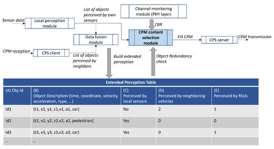 In this section, we propose several CPM content selection schemes that take into account radio resource availability and/or presence of roadside infrastructure. The target CPM content selection system architecture for a vehicle is depicted in Figure 3. It should be noted that the architecture may be applied to roadside infrastructure providing CP service. Nevertheless, roadside infrastructure has higher communication, perception, and computing capability and lower density compared to vehicles, we consider that a CPM content selection control should be applied particularity to vehicles that tend to overload wireless channel whereas their contribution for cooperative perception is lower than that of roadside infrastructure [].