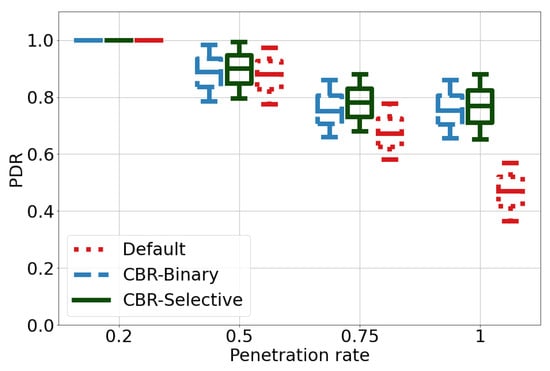 PDR function of penetration rate for CBR-Selective, CBR-Binary and Default algorithms.