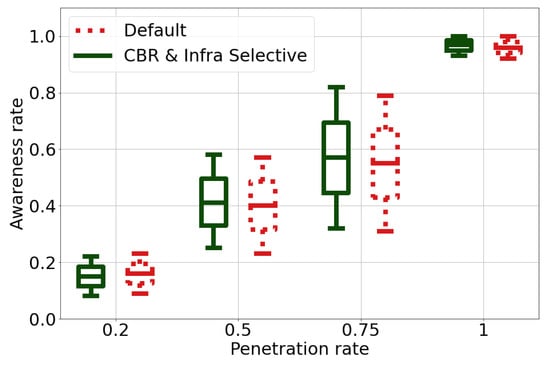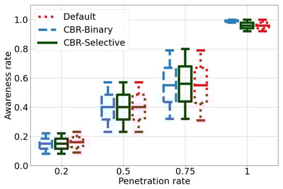 Figure 5 illustrates the awareness rates of the three schemes. First, we can notice that regardless of the scheme, the awareness rate increases with the increase of the penetration rate. This is an expected behavior because, in low penetration rate scenario, vehicles must rely mainly on their on-board sensors, which cover a small part of their surrounding environment, and hence they have low awareness rate. On the other hand, for high penetration rates, higher number of connected vehicles contribute in building collective perception, extending perception coverage, consequently increasing the awareness rate. Moreover, the figure confirms that CBR-binary and CBR-selective schemes have similar performances with the Default scheme.