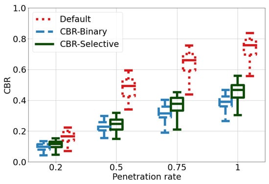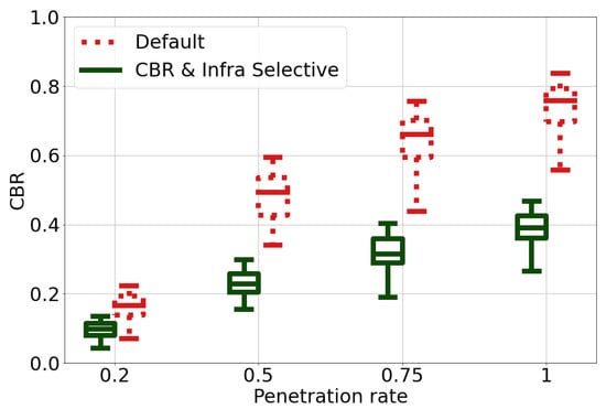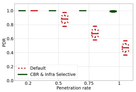 In this subsection, the schemes that take into account radio resource availability, i.e., CBR-binary and CBR-selective, are evaluated. Figure 4 shows the PDR performances of the different schemes. As expected, the higher the penetration rate, the lower PDR is, especially for the Default scheme. When the penetration rate is greater than 0.75%, both the CBR-binary and CBR-selective schemes perform better than the Default scheme. This can be explained as in these conditions, the proposed algorithms can sense the degradation of channel resource availability and control CPM’s transmission opportunity or contents. We notice that median PDR value can be maintained above 75% even in the highest-load scenario, i.e., 100% of penetration rate. This clearly indicates the benefit of the proposals in improving communication reliability.