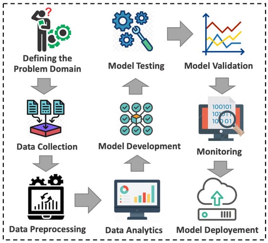 Artificial Neural Networks (ANNs), which have been used for time-series prediction [2], are made up of layers of connected units called artificial neurons that are connected by their edges with a weight value for each connected edge. For predicting the time series, machine learning methods and specifically neural networks, were exploited in the literature. In [3], an adapted version of the multi-layer perceptron (MLP) was exploited for time series prediction. This network had single hidden layer whereas the optimal number of the input nodes was defined based on 10-fold cross validation, with the inputs of observations 1 to predict time series at the point t then doing so to all the n-18 data. The method of scaled conjugate gradient was then employed instead of the ordinary backpropagation to estimate the optimal weights. Furthermore, the learning rate was chosen from the range 0.1 and 1, by using random initial weights to begin the training phase with maximum iterations of 500. ANNs with recurrent connection are called Recurrent Neural Networks (RNNs). RNNs are suitable for modelling sequential data for sequence recognition and making predictions [4,5]. RNN is made of high dimension hidden states with non-linearity units that are able to learn complex input-output relations and extract features automatically since it includes a input association that permits the past data to pass and hold on [6]. Some of the time-series applications fields where RNN is applied include speech recognition [7], sensor calibration [8,9], machine translation [10], buildings’ energy demand forecasting [11,12], air quality prediction [13] and stock market [14,15]. In general, the development of a forecasting model using any neural network model (such as RNN) consists of several steps and can be illustrated in the conceptual Figure 1.