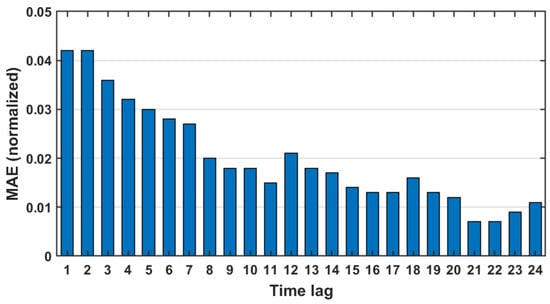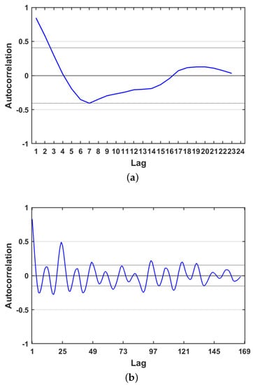 On the graph, the value of the autocorrelation function for each lag is plotted. In order to capture the correlation of observations on the current status, the autocorrelation coefficient function is plotted for 24 h and 168 h (one week) as shown in Figure 3.