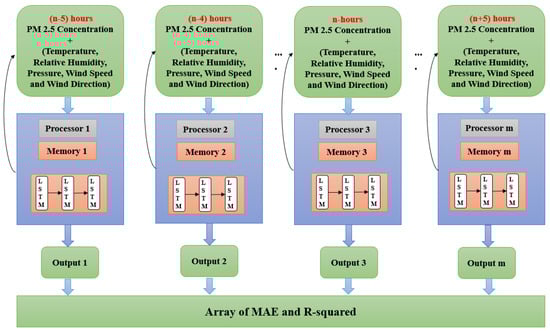 The indicators value of each processor output is saved in a list to compare them with each other. The processor that generates the least value of MAE and maximum of R-squared is conducted as the best predictor with the best value of time-lag. The overall architecture of parallel LSTM for n time-lags is shown in Figure 5.