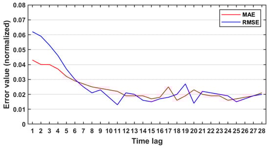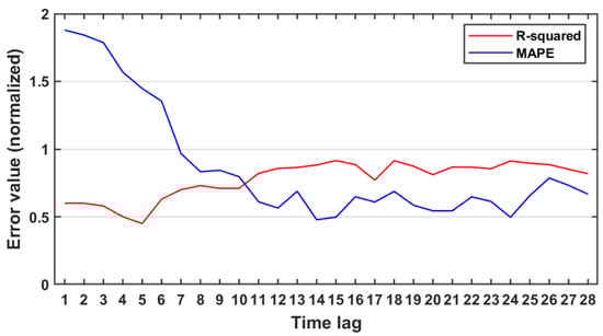 A continuous and repeated pattern can be seen from Figure 3b for every 24 h. This means that the observations are highly correlated for this period of time and the value 24 can be used as a time-lag value.