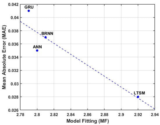 Mean absolute error (MAE) versus model fitting (MF) of the model ANN, LSTM, GRU and BRNN.