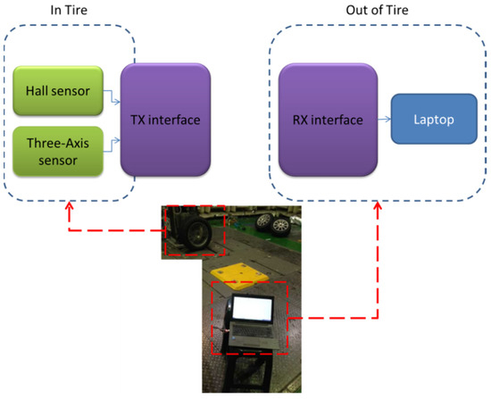 The concept of the tire pressure monitoring system is to collect tire information and analyze data from the tire. We propose a framework to improve the method. The framework is described in this section and the method is based on a wireless communication structure. There are two parts of the framework, sensors inside and outside the tire. Figure 1 shows the system architecture of the framework. The elements include a three-axis sensor, a Hall sensor, and a wireless communication device that is installed in the tire. The method needs a laptop to connect the wireless communication device. The laptop collects data from the in-tire sensors. The data collection and analysis platform are shown on the right side of Figure 1. The laptop provides all of the data collection, analysis, and algorithm implementation.