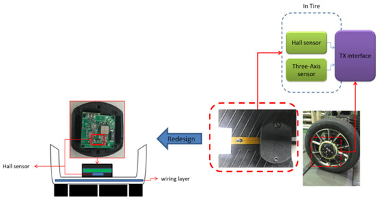 Figure 2 shows the sensor in the tire. The sensor signal is output by a wire. The wire runs through the wheel rim and connects to the RF transmission interface. The sensor is placed on an FPC which is fixed to the tire by pasting. The FPC with a three-axis sensor is installed on the tire surface inside the wheel. This type of fixing method is only for the experiments. There was a problem in the FPC reliability that required us to redesign the installation method. The new design integrates all sensors in a circuit. An integration device fixes the tire, and the Hall sensor is closest to the tire surface. This design ensures the Hall sensor can measure the maximum magnetic field value.