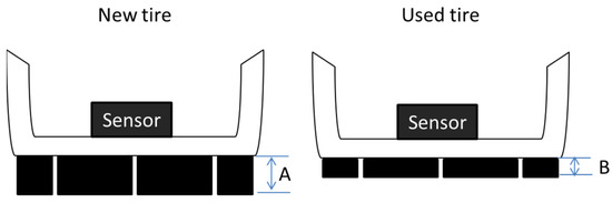 For our experiment, we obtained a tire from a manufacturer that used carbon nanotubes (CNTs) to establish magnetic properties. The production process and material properties to make carbon nanotubes magnetic are not discussed here. The magnetic field relates to tire wear. The tire has a higher magnetic field value when it is new. On the contrary, lower magnetic field values demonstrate tire wear. Figure 4 describes the expected state of the new and used tires. The difference between the new and the used tire is noticeable in the tire block thickness. The “A” thickness is larger than the “B” thickness. This shows that the new tire magnetic values are larger than those of the used tire. The Hall sensor provides the magnetic field information. If the tires have different wear conditions, the sensor provides different magnetic field values. This phenomenon can indicate tire wear. We used these properties to implement the application.