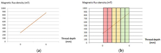 The wear estimation algorithm references some characteristics of the tire through the magnetic field. The manufacturer provides a tire spec that denotes the relationship between wear and magnetic field. Figure 5a shows the curve of the related wear status and the magnetic field value. The method defines some segments to present tire wear status, as shown in Figure 5b. The tire spec denotes the effective block thickness as 6 mm. There are six statuses that are defined for this application and each status presents with a 1 mm thickness.