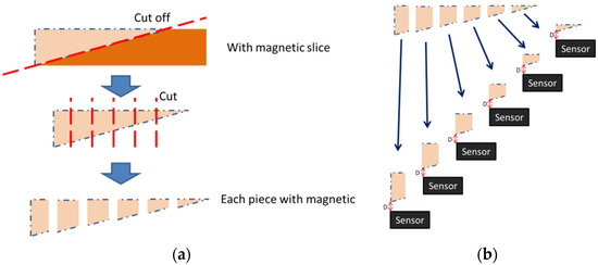 Magnets can be a source of magnetic fields, but our method does not use them. Different types of magnets have different magnetic fields. We tried many types of magnets for the experiment and found that the magnetic value cannot be used because although some magnets can provide a strong magnetic value, they must be installed by the manufacturer. On the other hand, some types of magnets cannot provide large enough magnetic fields for the Hall sensor to detect, because the tire has a wiring layer that can shield some magnetic forces. For our experiment, the tire manufacture prepared a tire slice with a magnetic field that resembles real-world conditions. We used the tire slice to verify the magnetic force change trend, checking the different thicknesses of the tire rubber with different magnetic fields. The tire slice was cut into six pieces, each piece having a different thickness. Figure 7a shows the six tire pieces. The different tire pieces have different magnetic fields. We checked the magnetic field with the Hall sensor. Each tire slice measured by the Hall sensor is shown in Figure 7b. The distance “D” between the Hall sensor and every tire piece is the same. The results can help us to understand the different magnetic fields of tire slices with different thicknesses.