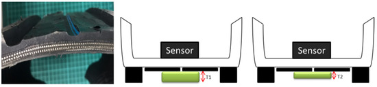 The strategy used a rubber piece with a magnet to simulate the magnetic field. The rubber was put in the same position as the tire slice. Figure 8 shows the method of measuring the magnetic field. The rubber was then put onto the tire slice. The method used rubber slices with different thicknesses to generate different magnetic fields. The Hall sensor can obtain different values according to the different magnetic forces. The thickness of T1 was larger than T2. The strategy delivered two results. First, the method verified the magnetic field trend without the tire slices to ensure that the rubber pieces had a magnetic field and that the trend was related to the thickness. Second, the method verified the magnetic field trend with the tire slice. The magnetic field was affected by the medium, as expected, because the tire slice has a steel belt layer. Some degree of the magnetic field is masked by the steel belt layer, which reduces the magnetic field strength. Therefore, the value of the magnetic field sensed by the Hall sensor will decrease; this is also predictable. We discuss the results in the next section.