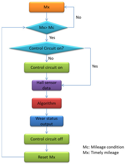 We designed a control circuit to control the Hall sensor power source to reduce the power consumption of the system. This control circuit always cuts off the power source. The Hall sensor does not work when the condition is not satisfied with the trigger value. Figure 9 shows the process flow. The mileage information is the trigger condition of the process. Different mileage conditions can be set. The process is executed every 1000 km when the mileage condition (Mc) is set to 1000 km. The Mc is reset after the process outputs the wear result. The Hall sensor circuit will be not executed before the next condition is satisfied. This process can effectively reduce power consumption.