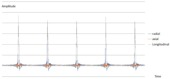 The second part of the method is the mileage estimate. The method uses a three-axis sensor that provides data in three directions: longitudinal, radial, and axial. The information from the three-axis sensor is the tire movement direction. The mileage estimation method uses the information and develops a method to analyze tire behavior. Figure 10 shows the information that the method catches from the tire through the three-axis sensor.