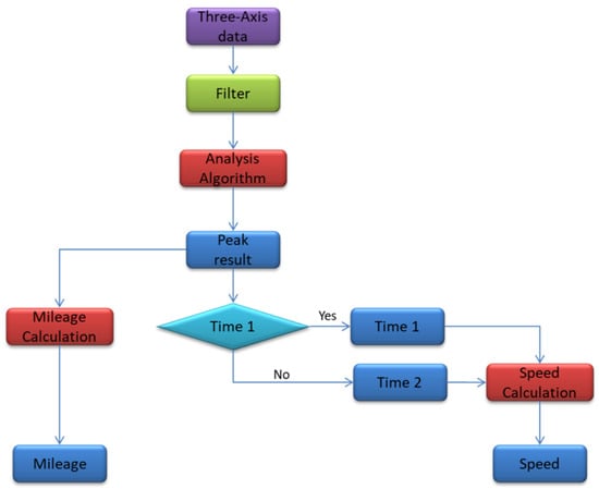 Figure 11 shows the flow for mileage estimation. The three-axis sensor provides the tire motion information to the collection system. The algorithm cannot directly use the information because the information includes noises. A filter is a necessary solution to field some noises. The filter that the method uses is IIR (Infinite Impulse Response). All three-axis information through the filter is provided to the algorithm. Through the filter, the algorithm can find the peak values of the three directions more easily. The peak value from the longitudinal direction provides two kinds of information, which are mileage and speed. The number of tire revolutions multiplied by the tire perimeter is the mileage, because the mileage information relates to the tire perimeter. Speed information is detected through the time gap of longitudinal information. The time gap is from the two peaks of the longitudinal value. We explain the detailed algorithm in the next section.
