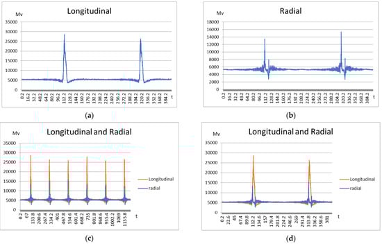 Longitudinal and radial function are the method conditions that the method references. There are two parts to the method, one is estimating the tire mileage and the other is verifying the mileage value. Figure 12 shows the three-axis measurement data, where t is the measurement time in milliseconds and Mv is measurement values in the sensor’s resolution. The resolution is between 0 and 65,535. The longitudinal value is shown in Figure 12a. This method uses an analysis algorithm to find the peak value and, at the same time, record the time that the peak value occurs. There is a time gap between the two peaks. This method uses the time gap to calculate the speed and the method can use the value to verify distance. Equation (6) provides speed data, where SPDavg is tire speed, C is peak number, R is tire radius, and t is the pulse time. Equation (7) provides mileage data, where L is tire mileage, R is tire radius, and C is peak number. The value correctness is important for the application. The method uses radial data to ensure the value. The radial value is shown in Figure 12b. Figure 12c,d also compare longitudinal and radial values to find the relation between the two values. Figure 12c has 60,000 sample points of data and Figure 12d has 20,000. The longitudinal and radial values exist at the same time after observing the experimental results. This method uses this characteristic to verify the correctness of the result.