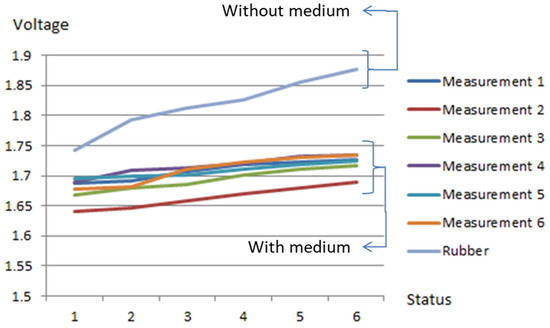 The tire wear status is presented by voltage value because the method measures the magnetic through the Hall sensor. The Hall sensor converts the magnetic flux density to the voltage value. There are two groups of results shown in Figure 13. Group 1 is the rubber magnetic value. The value set is measured by each piece, and there is no medium. Group 2 is the measurement data with a medium. The result is compared by the different measurements with or without the tire. The tire can affect the magnetic flux because the tire has a wiring layer that can shield some magnetic forces. The results show the influence of the medium. Although the results are somewhat biased, they have a trend. The deviations are due to measurement techniques and the experiment’s tire slices. Because there is no guarantee that the rubber will be placed in the same position every time, this can cause a measurement error. The impact of deviations is ignored in this experiment. Figure 13 describes the magnetic trend discovered through some measurements. The figure has six measurement values. The six measurement values compare the rubber magnetic value, representing the medium’s influence. If the measurement has a tire as the medium, the Hall sensor senses that the magnetic field value is reduced. The result can describe the magnetic flux density change as a trend, and the effectiveness of the method is verified. Figure 13 shows that the magnetic values are not the same, but the values have the same trend. The result fits the concept of the method. This phenomenon can affect the method design. This is the reason why the method uses mileage information to support the wear measurement.