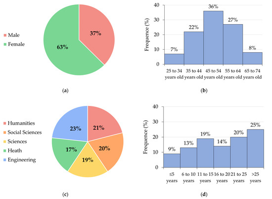 In Figure 2a, it can be observed that there are notably more females than males (around 67% more). In terms of age ranges, the largest number of participants is in the middle range, from 45 to 54 years old, with the least number of participants at the extremes (from 25 to 34 or from 65 to 74 years old). It can be seen that the distribution by areas of knowledge tends to be more homogeneous, although with a certain superiority in the Engineering area (Figure 2c). With regard to teaching experience, the sample of participants with more than 25 years of experience is clearly in the majority, followed by those with between 21 and 25 and those with between 16 and 20 years of experience. The lowest frequency is found among participants with less than or equal to 5 years of experience. Finally, although there is a certain superiority in the number of teachers from public universities than from private universities, the difference is very small, in relative terms. In fact, the statistics of the chi-square test of goodness of fit with one degree of freedom (chi-square = 1.3196, p-value = 0.2507) allow us to assume, with a significance level of 0.05, that the participants are distributed homogeneously between teachers from private and public universities. For the rest of the independent variables, the chi-square goodness-of-fit test statistics yield p-values below 0.05, which does not allow the corresponding distributions of participants to be homogeneous within the sample.