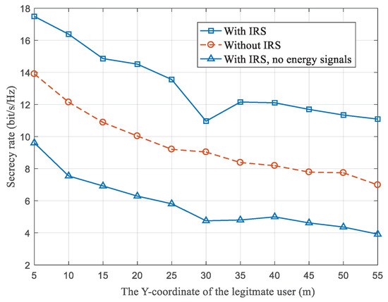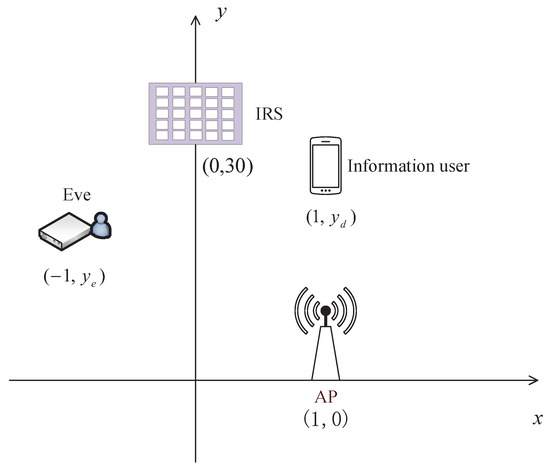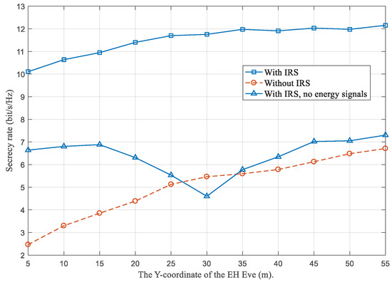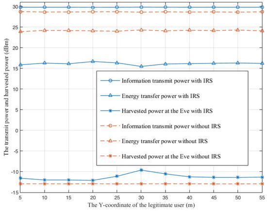 In this section, we present numerical results to show the achievable secrecy rate performance of the IRS-assisted SWIPT system with an energy-harvesting eavesdropper. In the simulation, we consider a two-dimensional coordinate system where the AP with antennas, the legitimate user, and the energy harvesting eavesdropper (each equipped with one antenna) were located at , , and in meter (m) in the X-Y plane, respectively. It is assumed that the IRS composed of reflecting elements, the center of which is deployed at in the X-Y plane and is 3 meters high from the X-Y plane. We consider two cases: (1) the location of the energy-harvesting eavesdropper fixed at , while the legitimate user moves along the horizontal line parallel to the y-axis in the X-Y plane from the location to ; (2) the location of the legitimate user fixed at , while the energy-harvesting eavesdropper moves along the horizontal line parallel to the y-axis from the location to . The simulation setup is shown in Figure 2. In both cases, we compare the performance of the IRS-assisted SWIPT system considered in this paper with that of the SWIPT system without IRS.