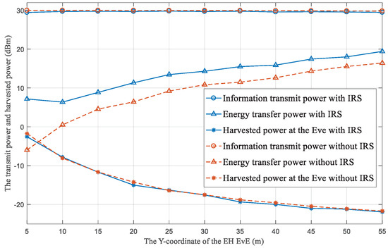 The transmit power at the AP and the harvested power at the Eve versus the Y-coordinate of the Eve.