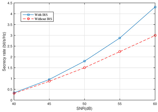 In order to show the secrecy rate with different SNR levels, we fix the locations of the IR and EH Eve at and , respectively. The transmit power Ps at the AP are set to 30 dBm, such that the minimum harvested energy requirements can be satisfied. We illustrate the achievable secrecy rate in Figure 7, assuming the mean power of the Gaussian noise varies from −10 dBm to −30 dBm, i.e., the transmit SNR from 50 dB to 80 dB. It is clear that the achievable secrecy rate increases with the SNR in both cases with or without the assistance of the IRS. From Figure 7, it can be found that the gap of the secrecy rates between the two cases becomes larger as the SNR increases. This further verifies the effectiveness of the proposed IRS-aided SWIPT system considered in this paper.