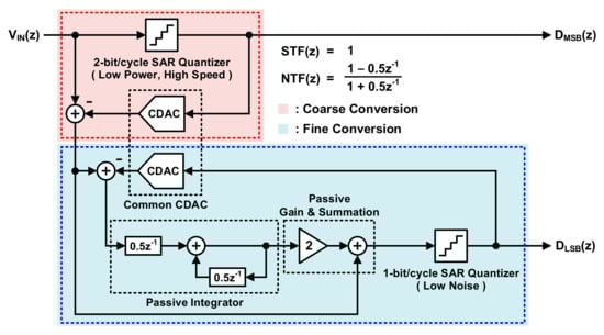 The proposed 2-then-1-bit/cycle noise-shaping SAR ADC performs fast and coarse 2-bit/cycle SAR conversion first. Then, it is followed by a fine conversion, which is a first-order noise-shaping SAR conversion based on 1-bit/cycle for accuracy, as shown in Figure 2. The fine conversion includes redundancy at the beginning to correct the error in the coarse conversion. The coarse and fine conversion can be accomplished on the same CDAC, as will be explained in Section 3, so each conversion can be optimized maximally without causing any mismatch issue or performance degradation.