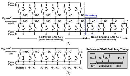 A multi-bit/cycle SAR ADC is a hybrid one that boosts conversion speed by utilizing a flash ADC in a SAR ADC [1,2]. It reduces the total number of comparisons by converting more than two bits per comparison cycle. Regardless of the high sampling rate, the resolution of a multi-bit/cycle SAR ADC is still limited by the same comparator requirement. A noise-shaping SAR ADC is another kind of SAR-based hybrid ADC, and it performs oversampling and noise-shaping similar to a ΔΣ ADC [3]. It can provide quite high resolution with very good energy efficiency; however, its bandwidth is often limited by oversampling and filter latency.